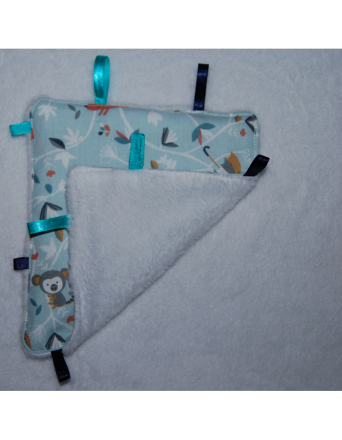 Ce doudou étiquettes est idéal pour les nouveaux-nés. Fabriqué avec une face en tissu minkee tout doux et une face en coton imprimé pour le plaisir de bébé. Les différents rubans placés sur les côtés viendront amuser les mains de bébé.